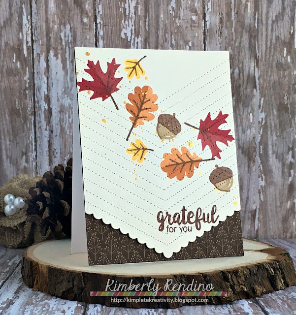 I started by stamping the GORGEOUS fall leaves from the Sunny Studio Autumn Splendor stamp set on a piece of cream cardstock. Next, I used the two stitched/pierced Fishtail Banner II dies and ran them through my die cutting machine repeatedly to create the fun texture. I finished the die cutting with the scalloped die. I added a few flecks of gold paint to the panel and then mounted it on foam adhesive to a piece of fun autumn patterned paper from Echo Park.