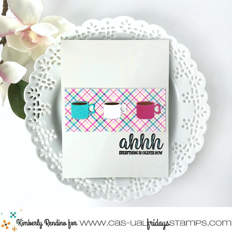 First up is the stamp set Cup of Coffee, along with the Coffee Cup Fri-Dies. So many cute sentiments in this stamp set!! Gah! I die cut the coffee mugs from a strip of patterned paper and again from a few colors of solid cardstock. I adhered the negative piece onto a pale grey card base, and adhered the coffee mugs back in place (die-cut inlay).